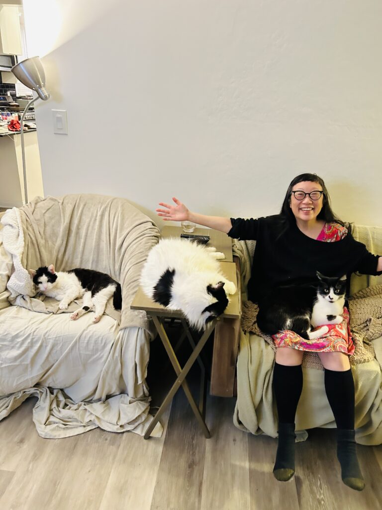 So far, the boys are getting along great. Here’s me with Rocky and his new brothers Oreo and Beethoven. Baby sister Charlotte is still hissy around Rocky but we hope they will finally get along soon. Yoo hope to have all four cats in one picture soon!