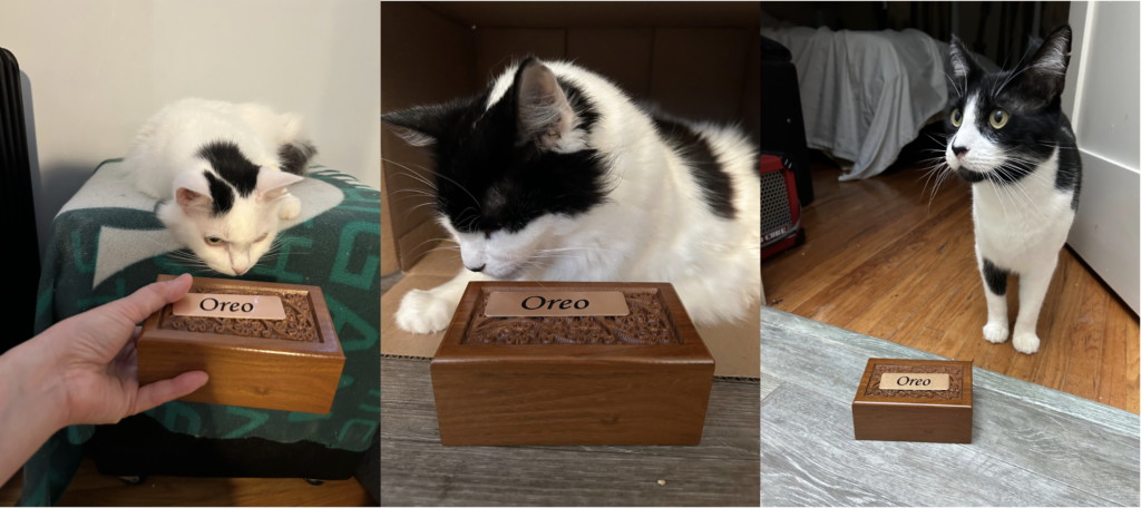 Oreo’s eyes remained open because I learned cats do not close their eyes upon death.